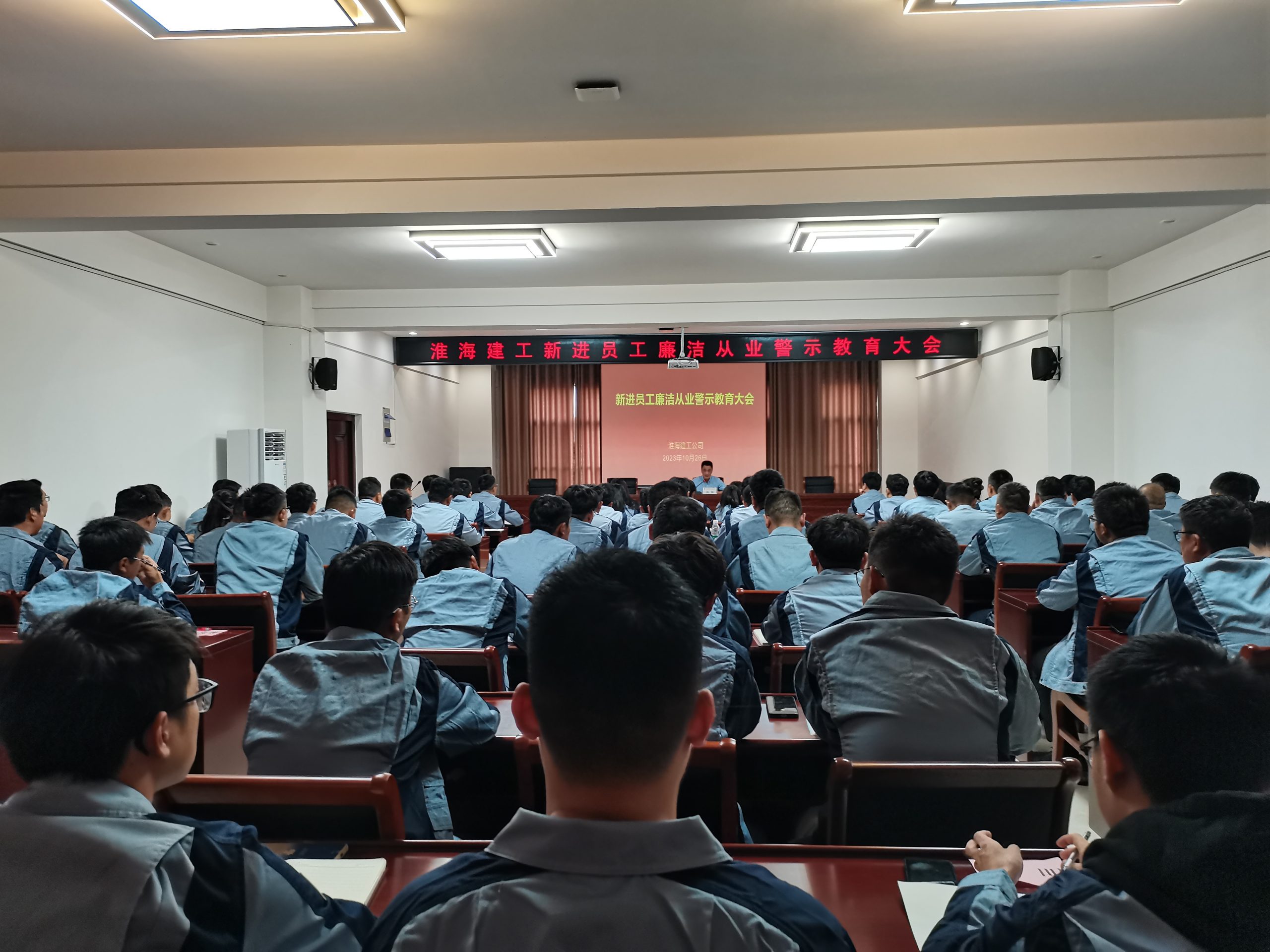 10月26日下午,淮海建工公司在四樓會議室召開新進員工廉潔從業(yè)警示教育大會。與會人員集中觀看了警示教育片《糧倉“碩鼠”落網(wǎng)記》。