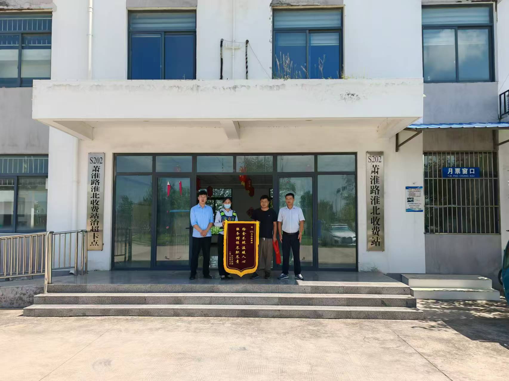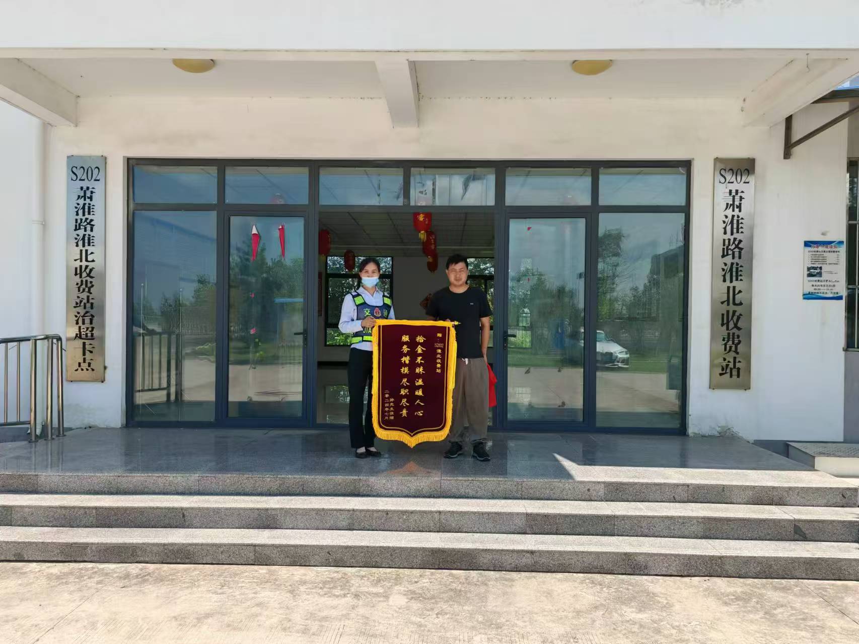 真的謝謝你們,沒接到你們電話之前,我已經(jīng)和家里的人找了好久了,一直不知道掉哪里了。感謝你們拾金不昧、樂于助人,送上小小錦旗,聊表謝意!”7月25日,在S202淮北收費站,失主孫先生送上錦旗一個勁地向工作人員道謝。